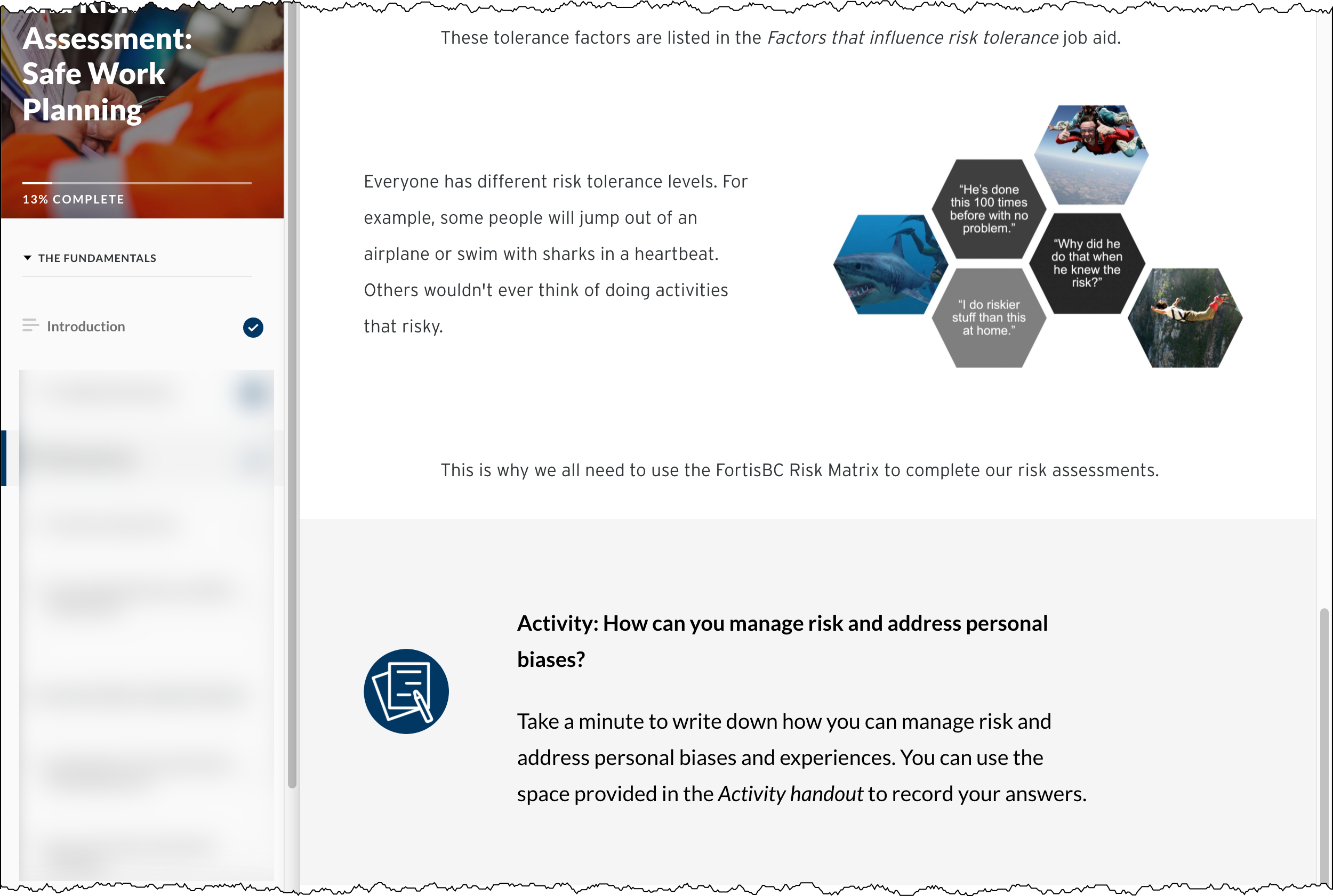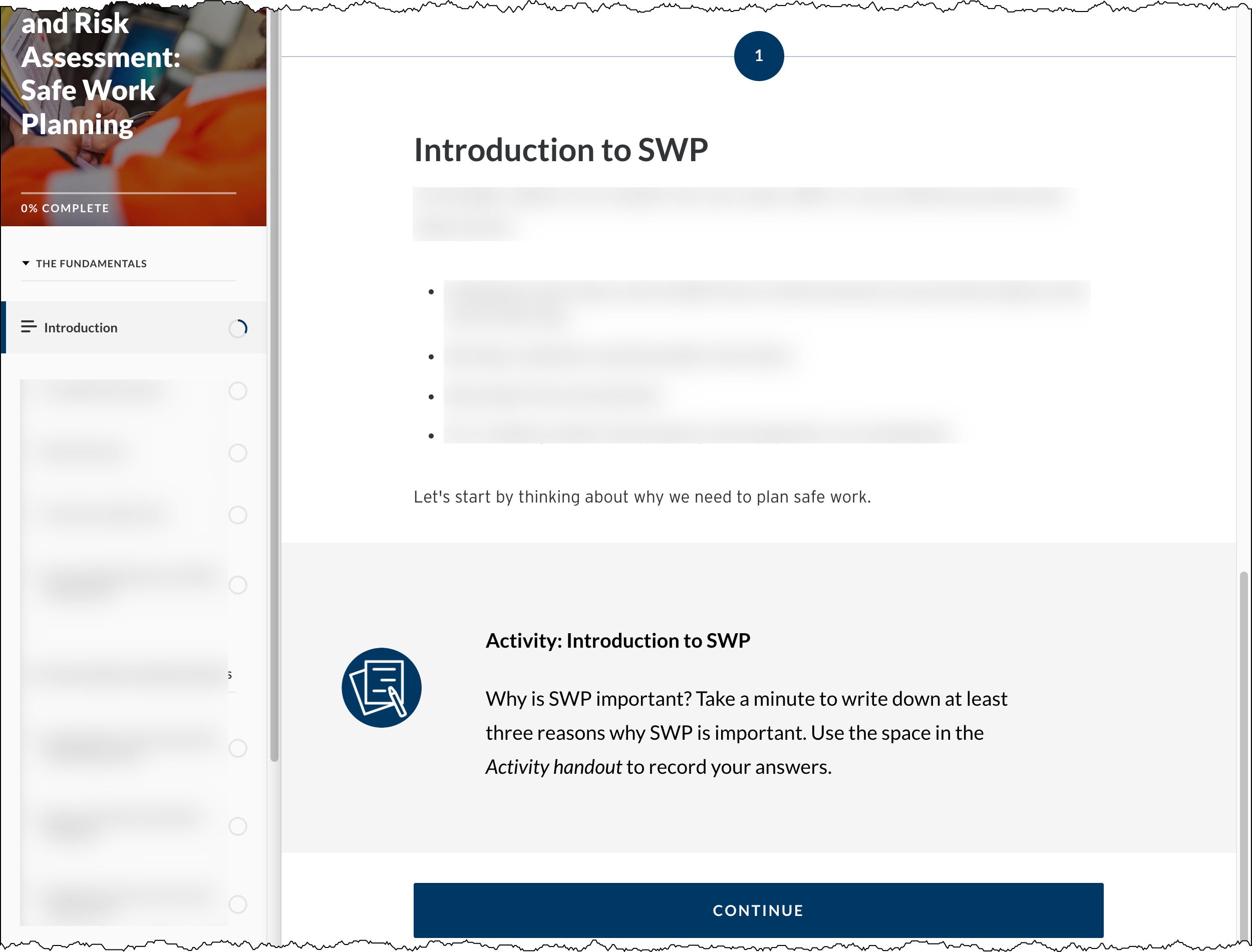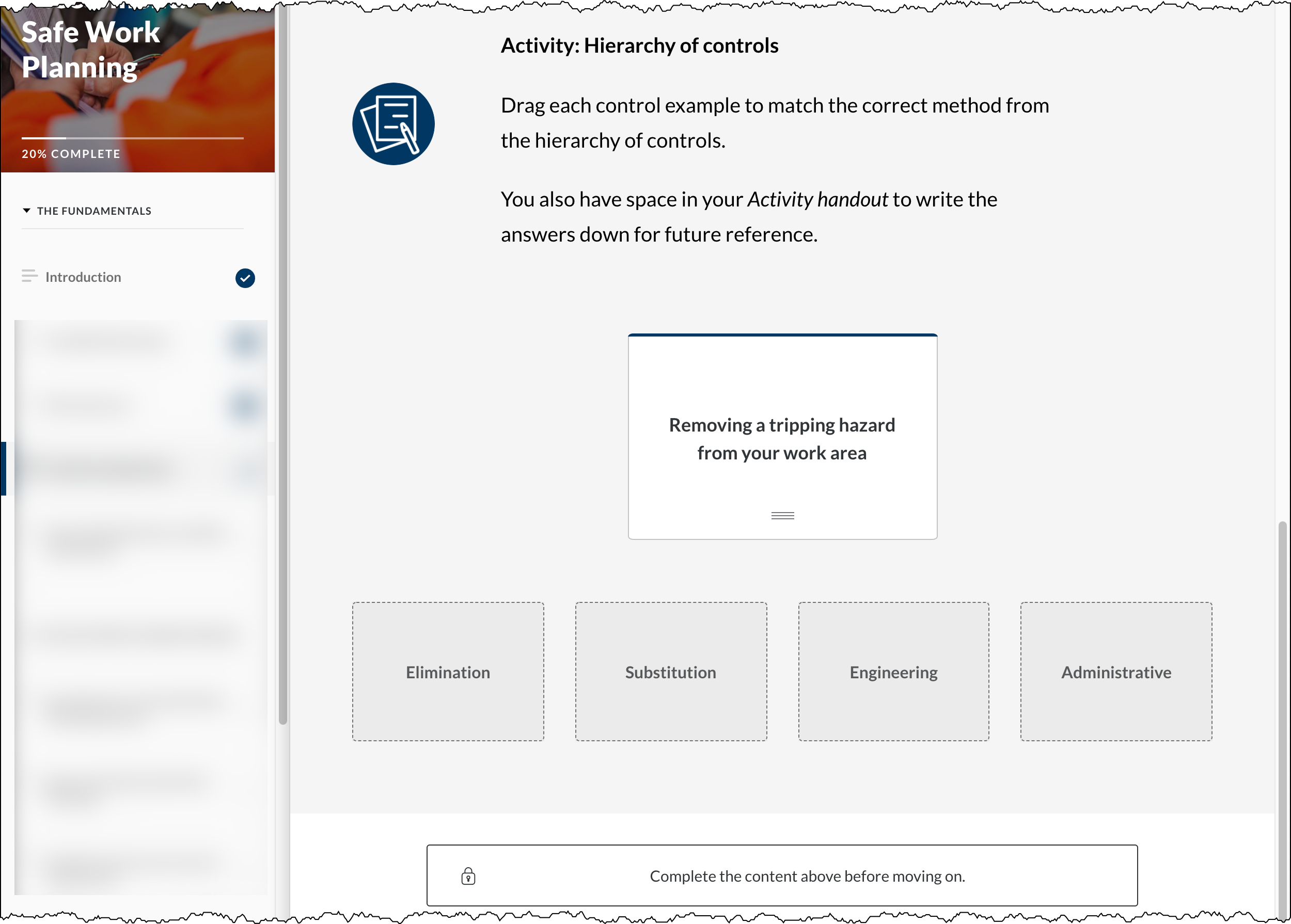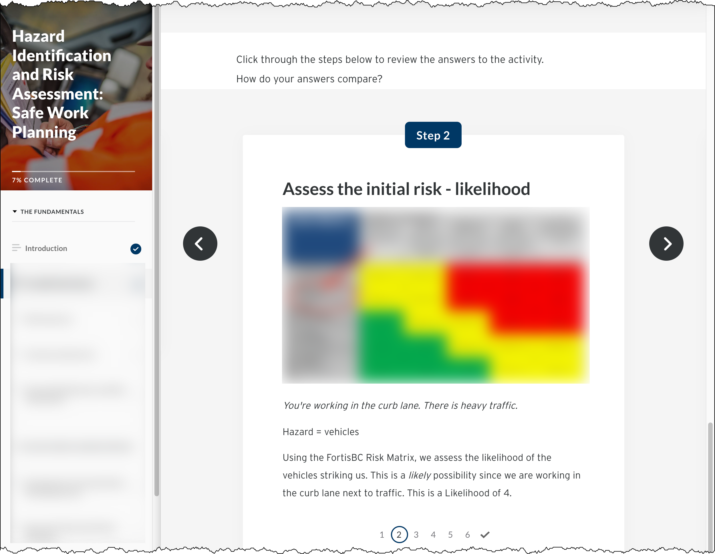We added self-reflection and knowledge check questions to the existing content. After that, we added work examples. The finished course lets employees receive the introduction to safe work planning materials. They don’t need to go to in-person training during the pandemic.