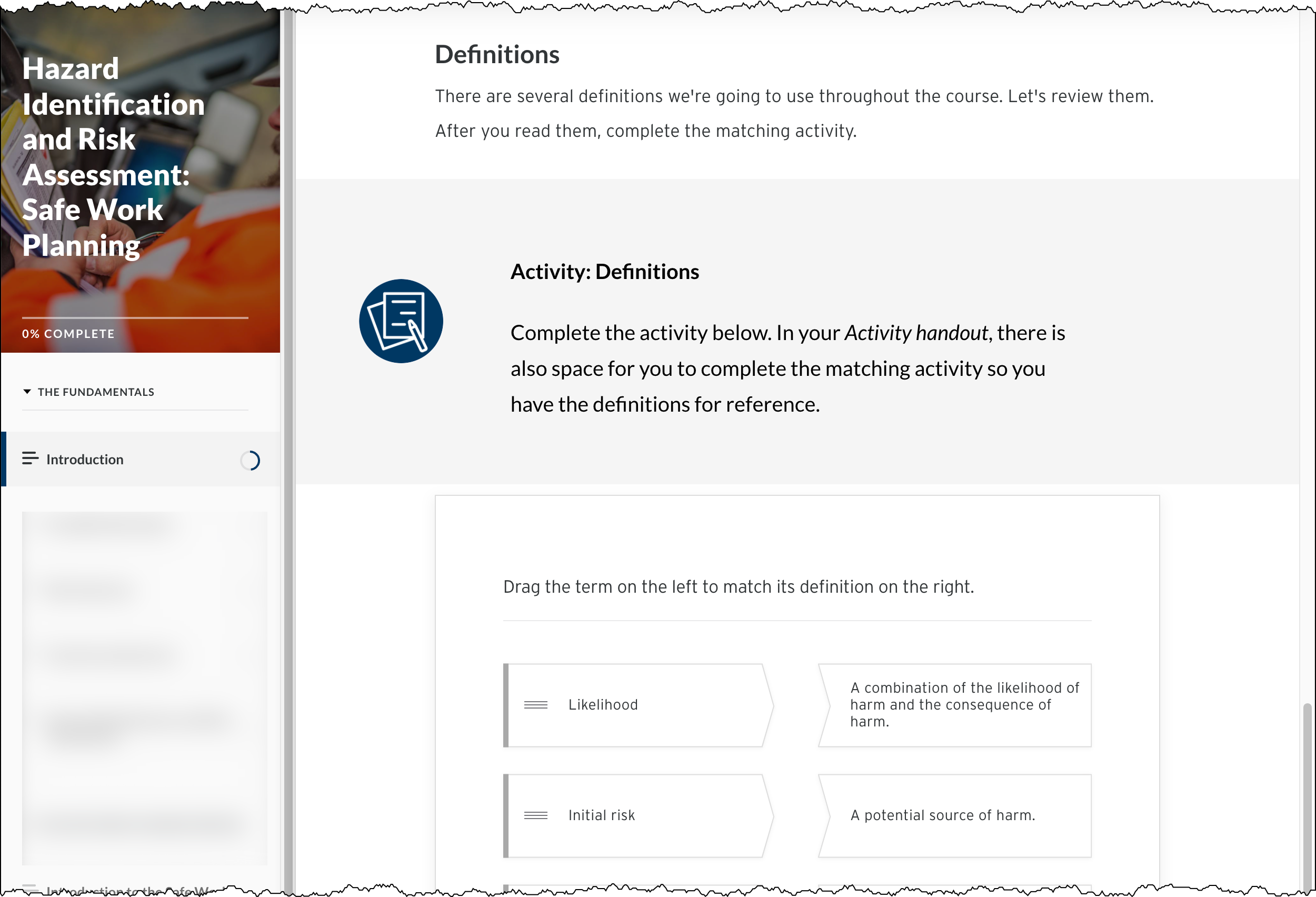 The course introduces participants to the safe work planning process. It also reviews company-specific forms and processes. In addition, participants apply concepts in activities. After this course, participants go to role-specific, in-person training. In addition, they use the concepts in safety briefings, manager safety checks, etc.